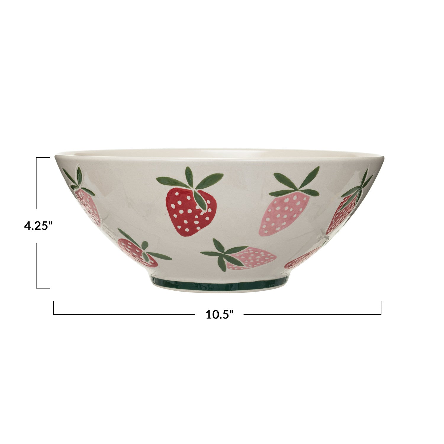 10-1/2" Round x 4-1/4"H Hand-Painted Stoneware Bowl w/ Wax Relief Strawberries