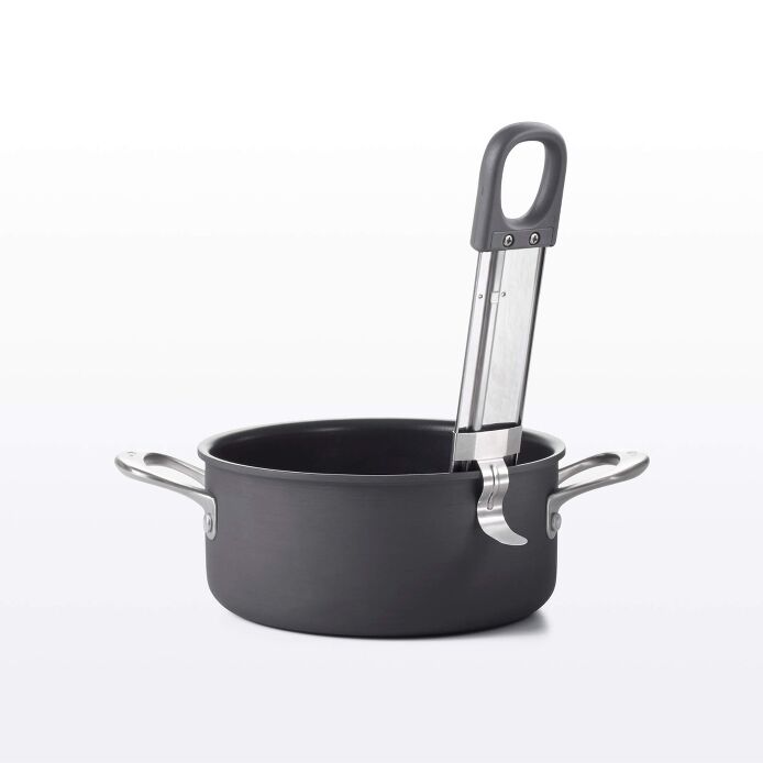 Opening in handle is large enough to fit a kitchen utensil through to lift out of pot.