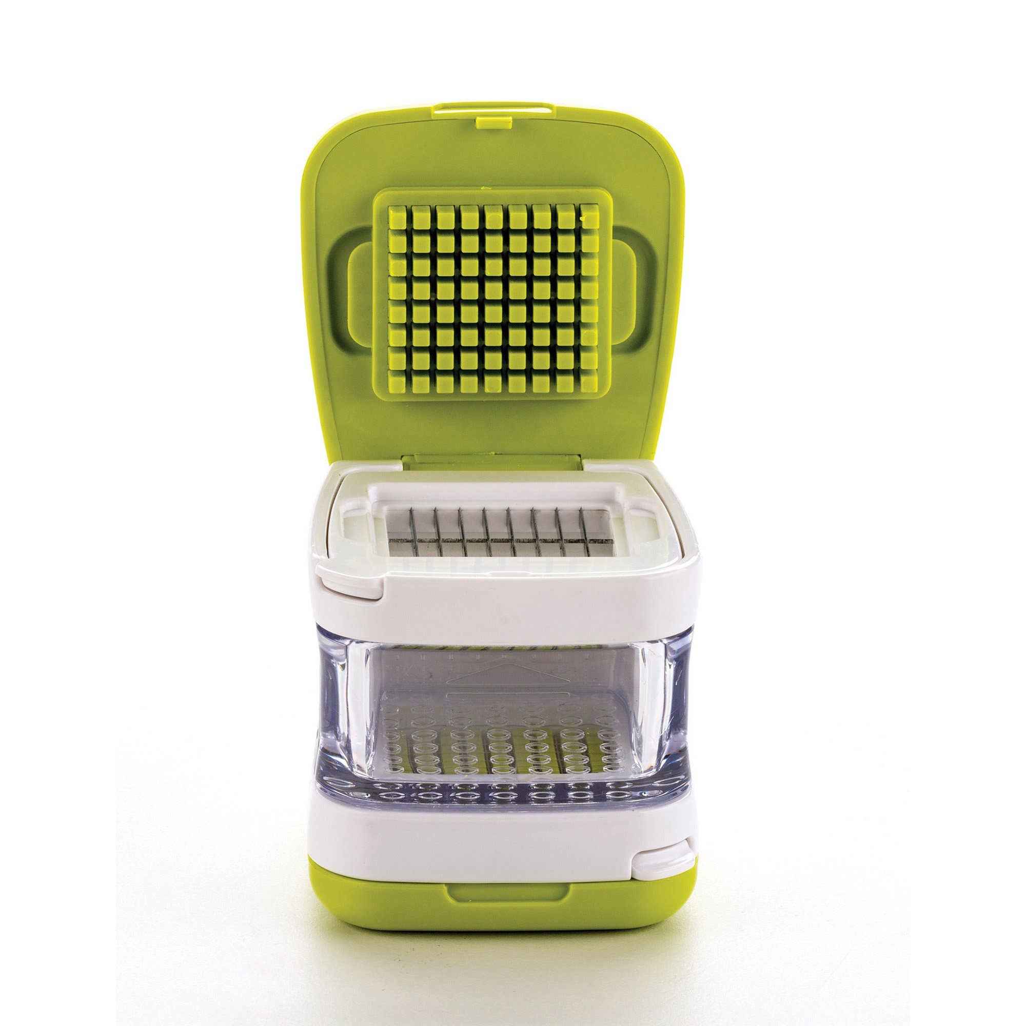 This compact gadget minces or slices peeled garlic and deposits It neatly in the clear bin. Simply open the Green lid for the mincing option, align the bin, or flip the cube and bin over for the slicing option.