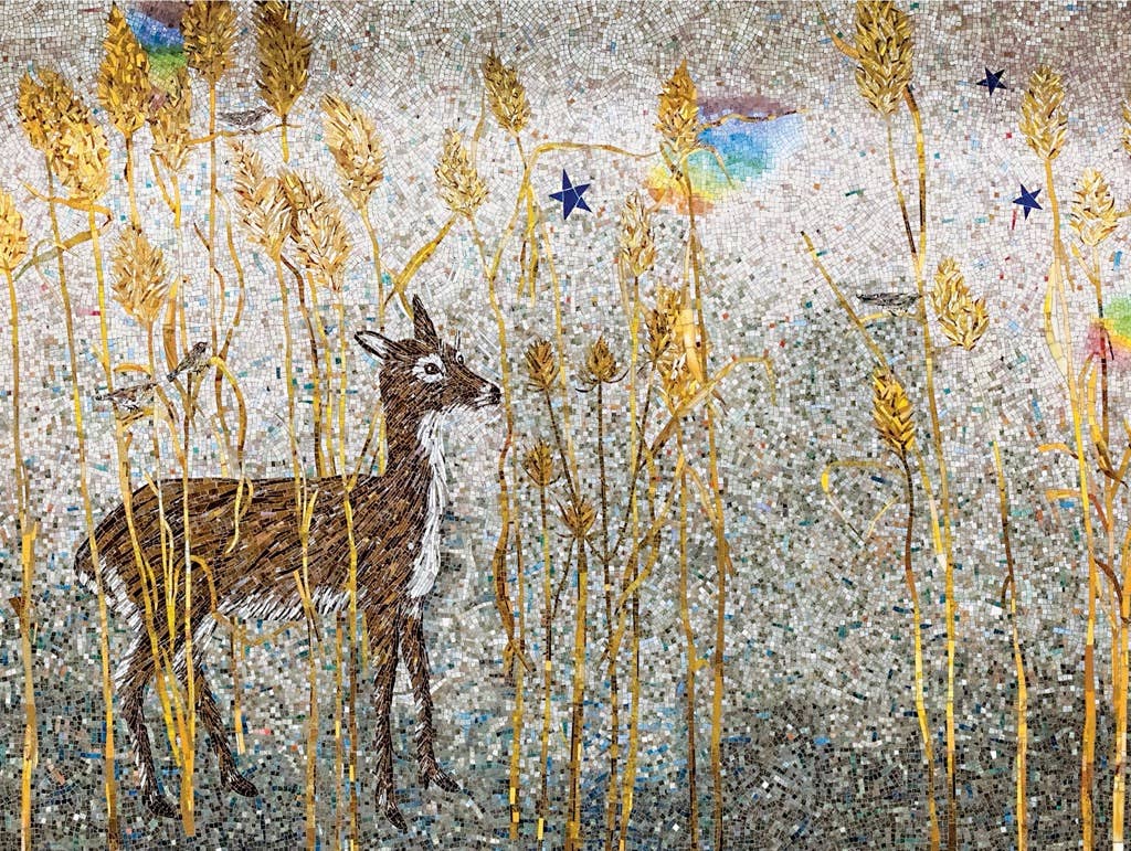 A lone deer stands in the landscape in this mosaic created by Kiki Smith for the MTA. The original artwork is a permanent display in an arched node wall on the Mezzanine level of Grand Central Madison. “I wanted places for people to say, ‘Meet you by the deer.’ ” - Kiki Smith