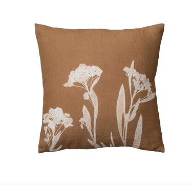 Warm up your space with this soft brown linen pillow featuring a printed floral design