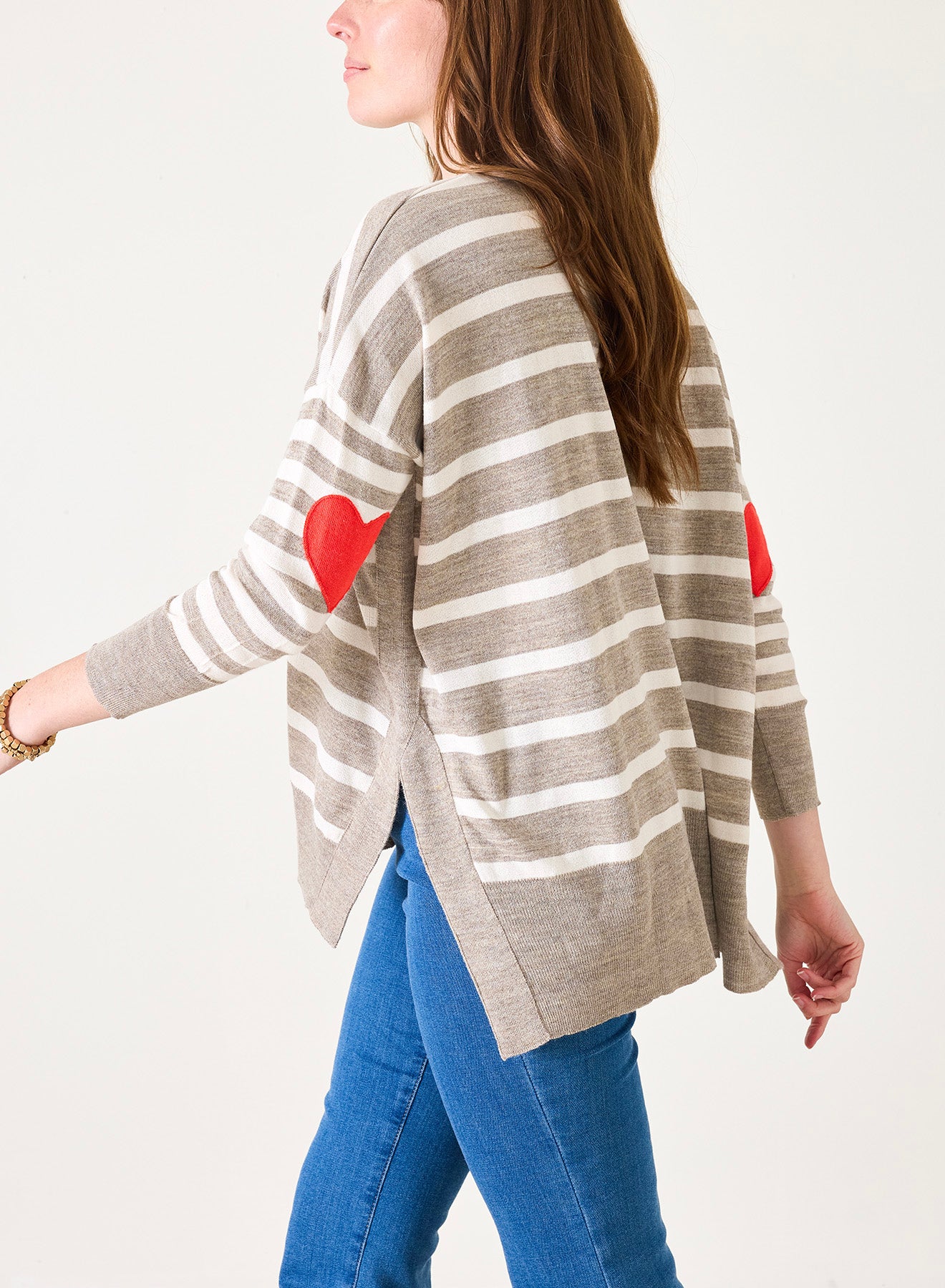 The Amour sweater says love best with darling little heart appliqués on the sleeves and stripes across the weave. With loose shoulders and signature side slits that move with you, Amour goes where you go—with lots of love and a sophisticated flair of charm and joie de vivre. This faithful travel sweater is your keeper for all seasons because—let’s face it—love is always in style.