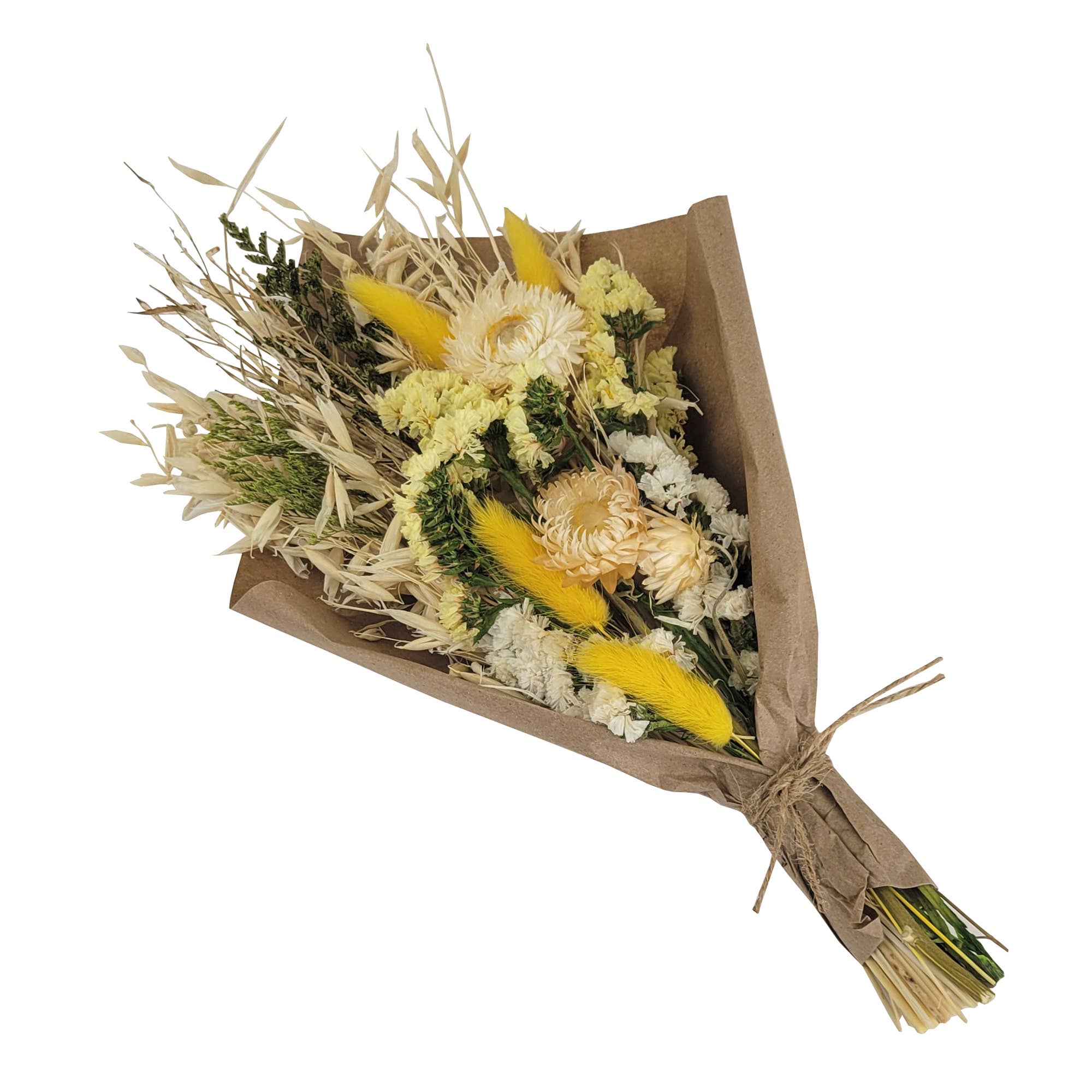 Our floral team designed this delicate & petite size bouquet using a mix of natural strawflowers, bunny tails, and avena to create this farmhouse bouquet look.