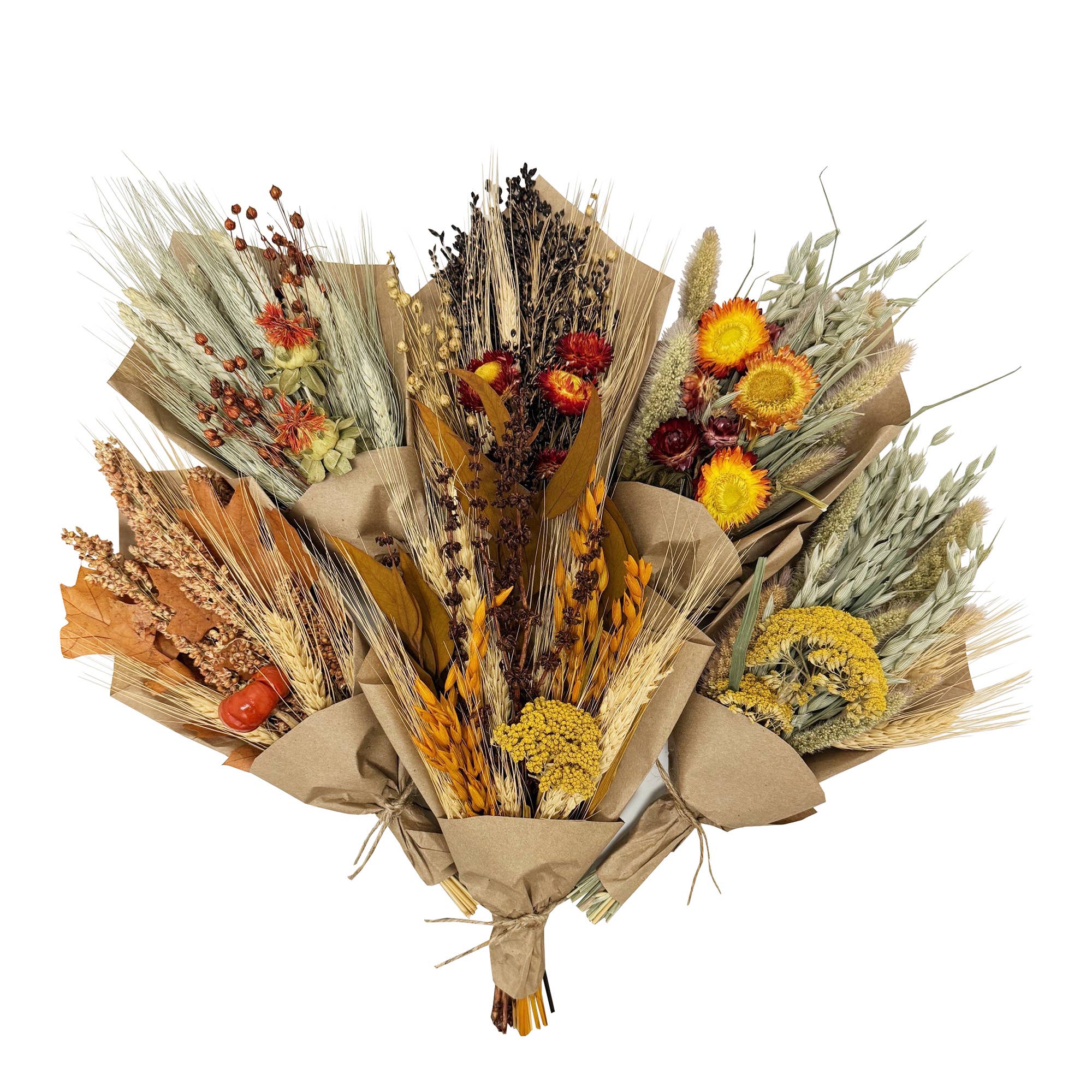Our floral team designed this delicate & petite size bouquet using a mix of natural pompino, oak leaves, triticum, and grains to create this harvest farmhouse bouquet look. Each bouquet is designed and handcrafted in our California design studio.