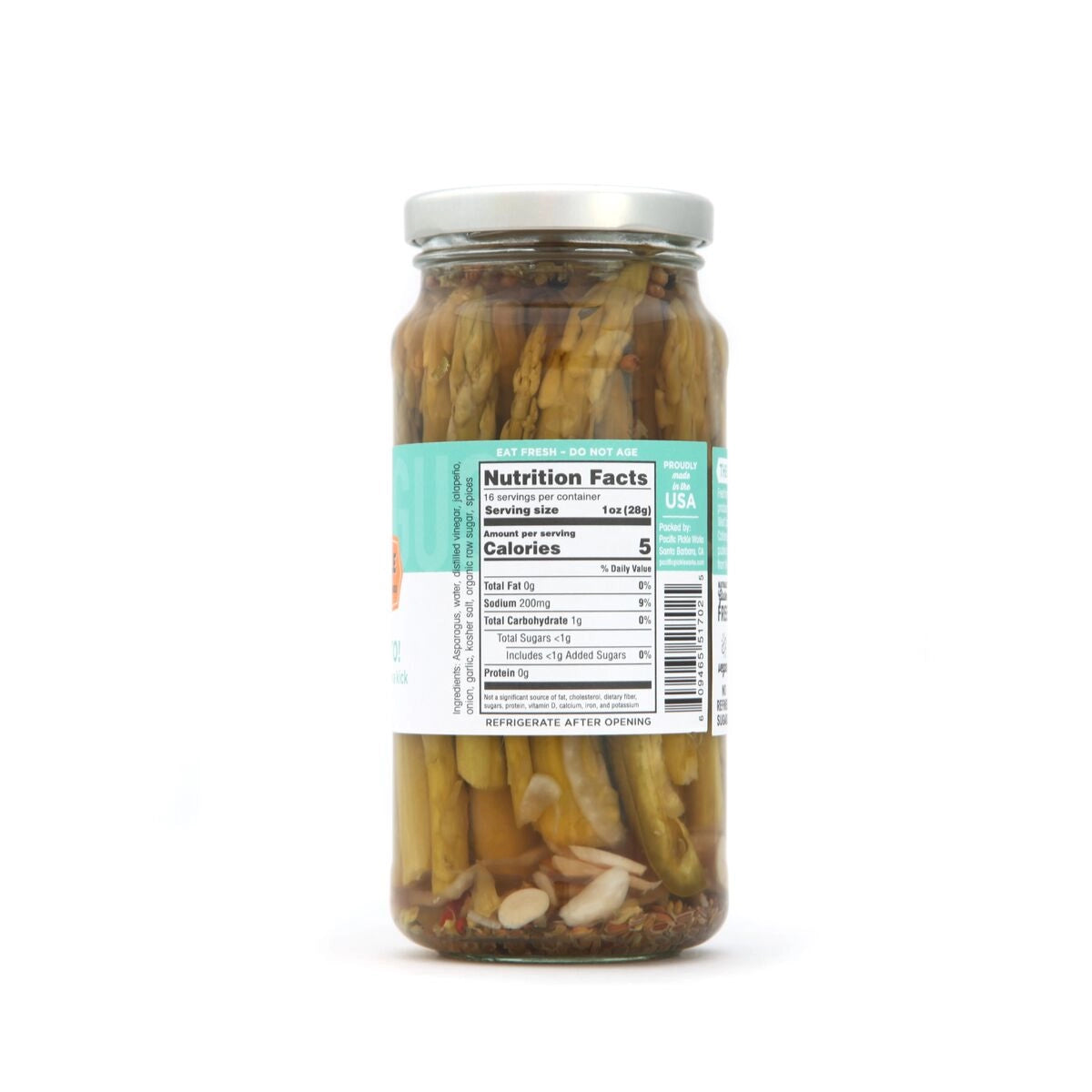 Ingredients: asparagus, water, organic distilled vinegar, jalapeño pepper, onion, garlic, sea salt, organic raw sugar, spices.