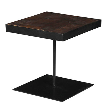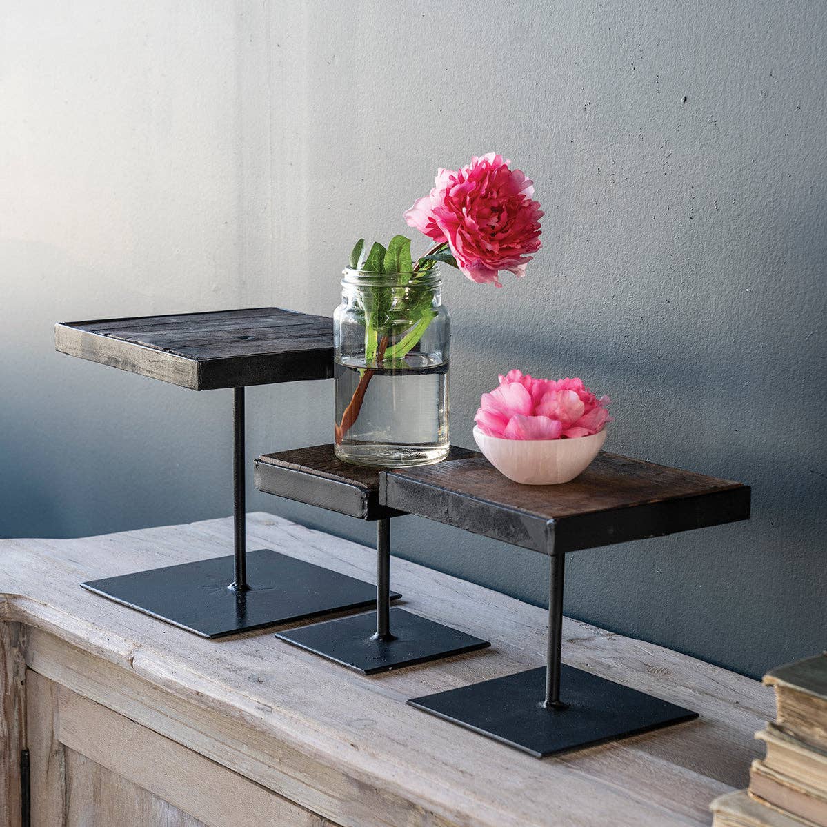 the Focal Riser is an attractive merchandising or display accent. The black iron frame is a simple square base construction that offers durability and style. The metal frame has an inset wood top that is finished in a natural wood tone.