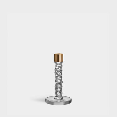 The Carat collection is based on a contemporary interpretation of the traditional cut glass for which Orrefors is world-renowned. The irregular geometry produces beautiful reflections of light in the crystal. The medium candlestick in clear glass is available as a set of 2 with details in brass. Designed by Lena Bergström.