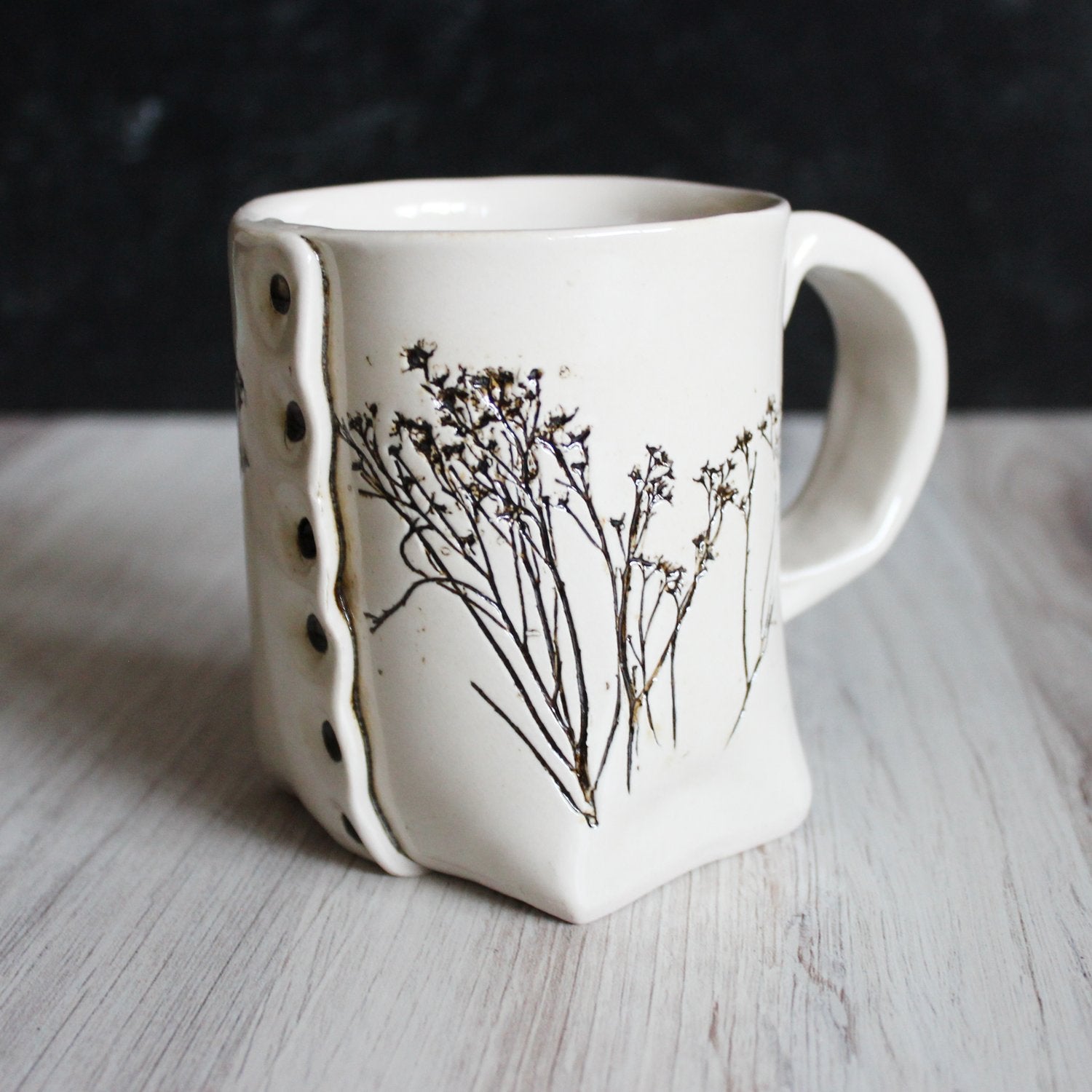 Each mug from Colleen Deiss Designs starts as a flat stoneware clay slab that’s pressed with one of a kind hand drawn stamps, real dried wild flowers, and/or real antique lace. Once formed by hand into their final shape they are bisque fired. They are then rubbed with stains to make the impressions pop and dipped in hand mixed glazes. Each one is high fired in rural Wisconsin out of her home studio.