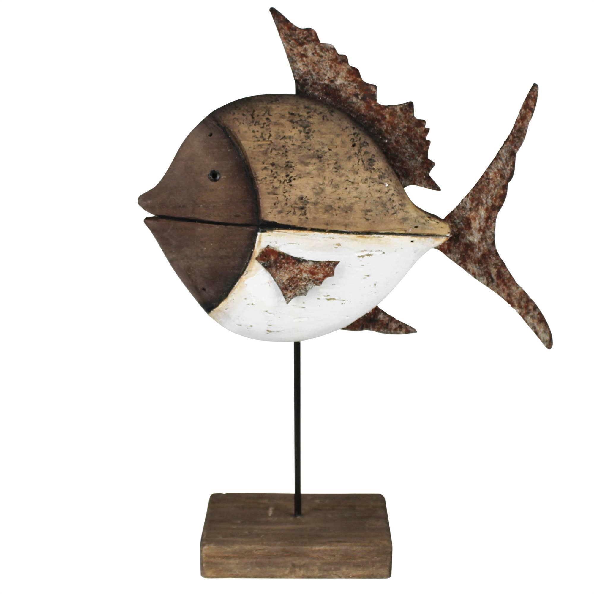 This duo of wood fish, fashioned from kiri wood and rusted metal perched on wood bases create an uplifting indoor seascape.