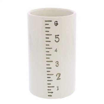 Created by using a lost wax process, the ruled graphics on our gloss white cylinders provide a rustic rule of scale to whatever the vessels may hold.