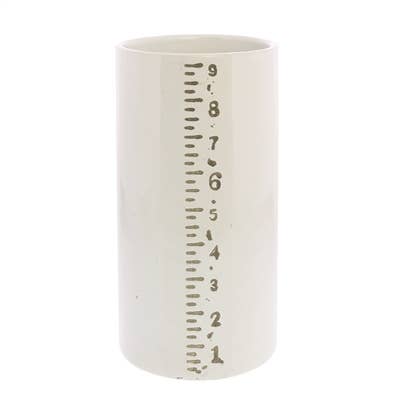 Created by using a lost wax process, the ruled graphics on our gloss white cylinders provide a rustic rule of scale to whatever the vessels may hold.