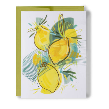 Three Lemons | Citrus Gold Foil Greeting Card (Single) This greeting card is a sweetheart… sweet tart! Inspired by the colors and shapes of citrus fruit, these cards are kissed with gold foil to elevate the every day greeting card. The card is blank inside and contains no words on the front, allowing it to be a wonderful carrier of loving words for any occasion.