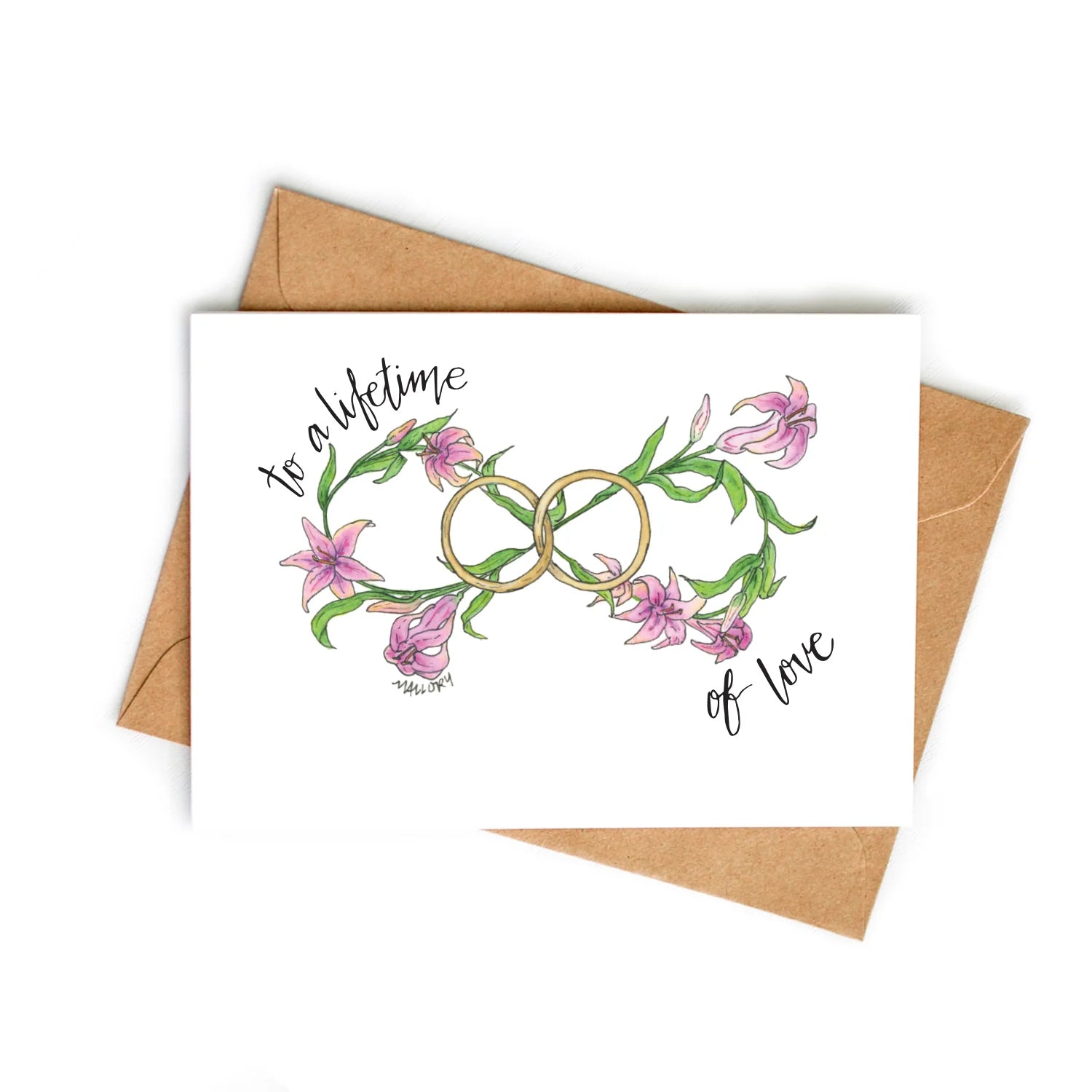 Share heartfelt wishes to the newlyweds with Lifetime of Love Wedding Card. This original design features two rings secured together, signifying eternal love. In the background, pink lilies stems are wrapped together in the form of the infinity symbol to add a beautiful pop of color. We're excited to offer metallic printing with this card! The rings have a beautiful shine with gold metallic ink. Original artwork created with pen and watercolor by the artist and owner of Stem and Soul, Mallory Wierzbicki.