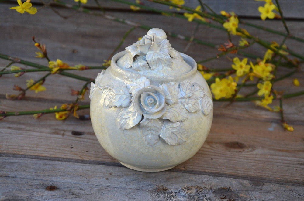 Ivory stoneware sugar bowl with roses and leaves by L’Officina. The enamel is granite blue with a very particular dotted effect. Dimensions: The sugar bowl has a diameter of 12 cm and a height of 12 cm.