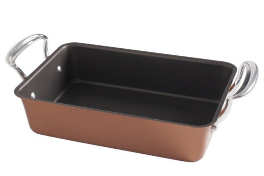 Our Roaster Collection features a stunning copper exterior finish and nostick interior for easy cleanup. Sturdy aluminized steel construction with polished cast aluminum handles. Generously sized handles are easy to grip, even with oven mitts. Stovetop safe as well!