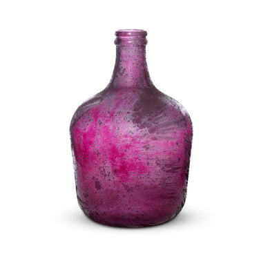Stunning frosted cranberry cellar bottle. Perfect for displaying seasonal branches and blooms as a centerpiece or decor item. Color is a deep violet plum with white frosting.