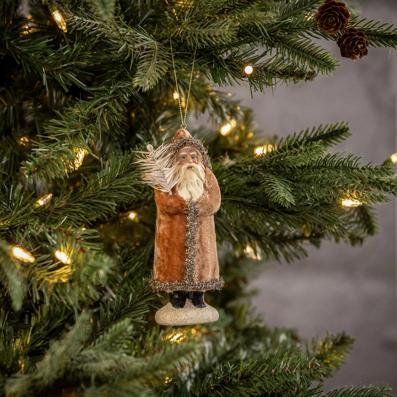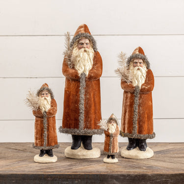 These Belsnickle are wearing a ginger orange coat, complete with silver fur. Their contents contain mache and velvet.