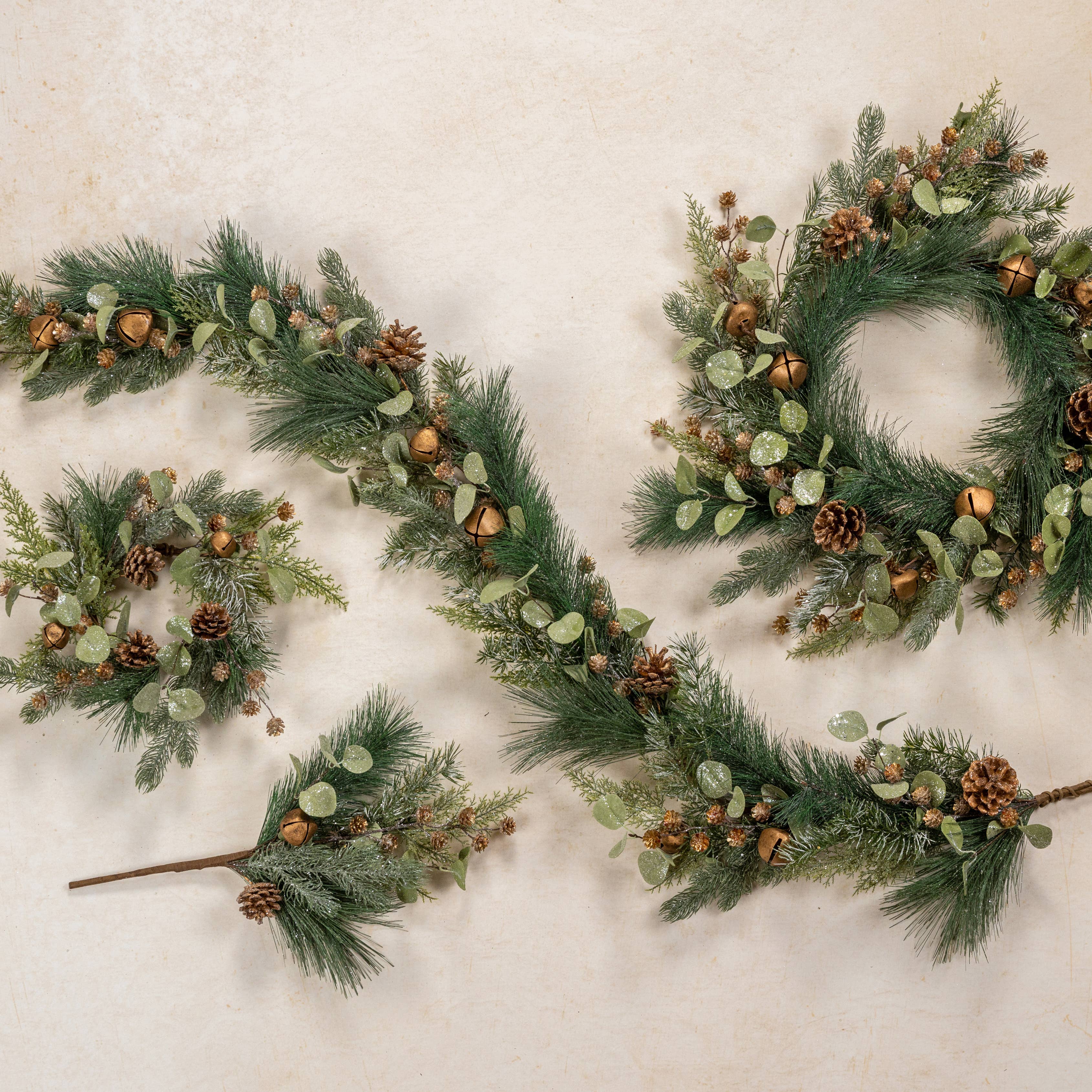 This 19" pick featuring pine, eucalyptus, pinecones, and bells adds a delightful touch - made of plastic and polyester.
