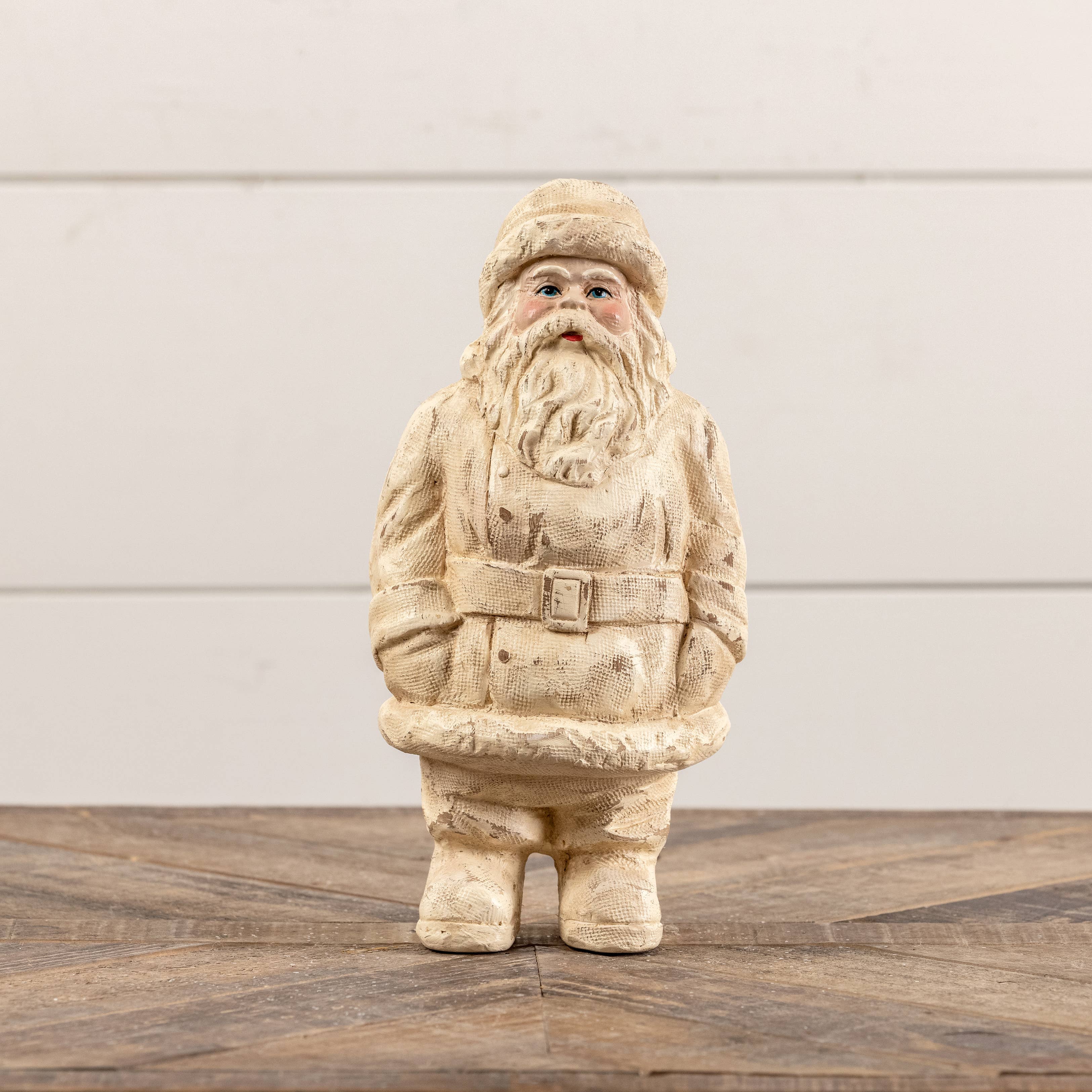 A vintage Santa, complete with a rosy-cheeked smile and a long, full beard, all in a whitewashed style.