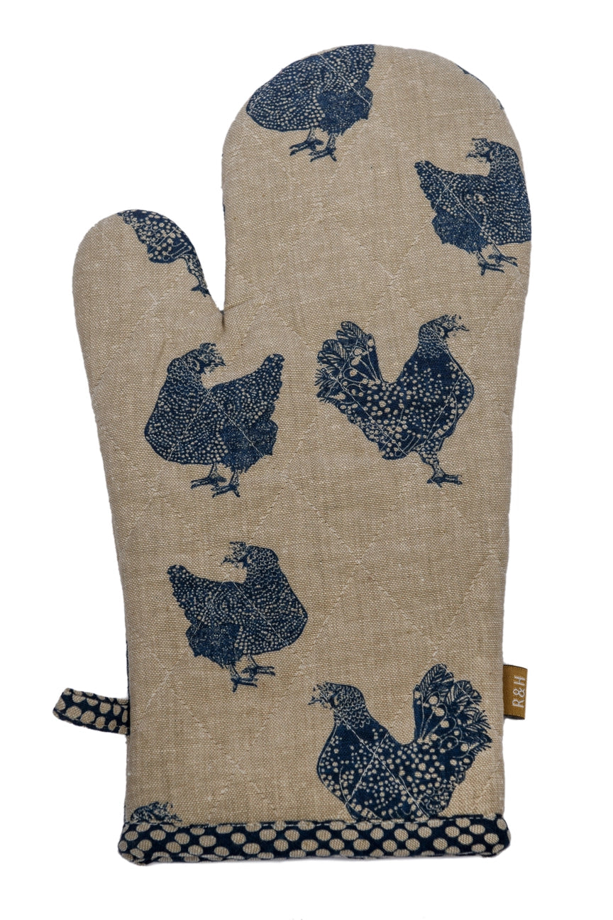 Protect your hands with a Chicken pattern Blueberry oven glove. Quilted from extra protection from the heat and feature a classic blue motif with French countryside designs of roosters and hens with none other than Henrietta herself.
