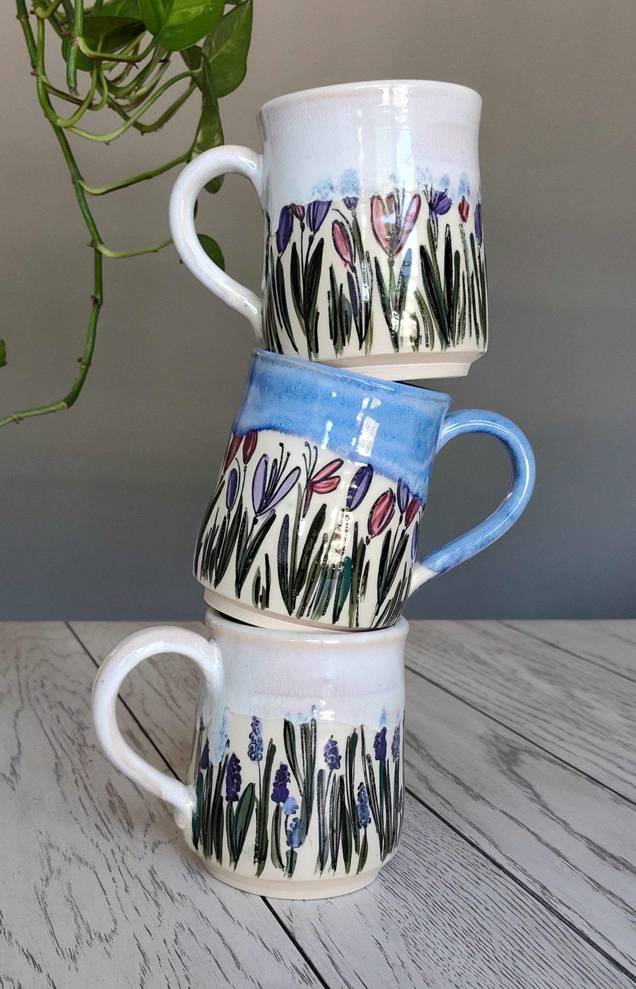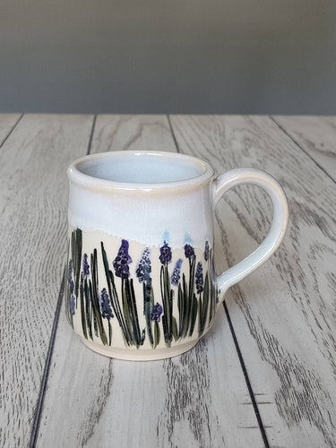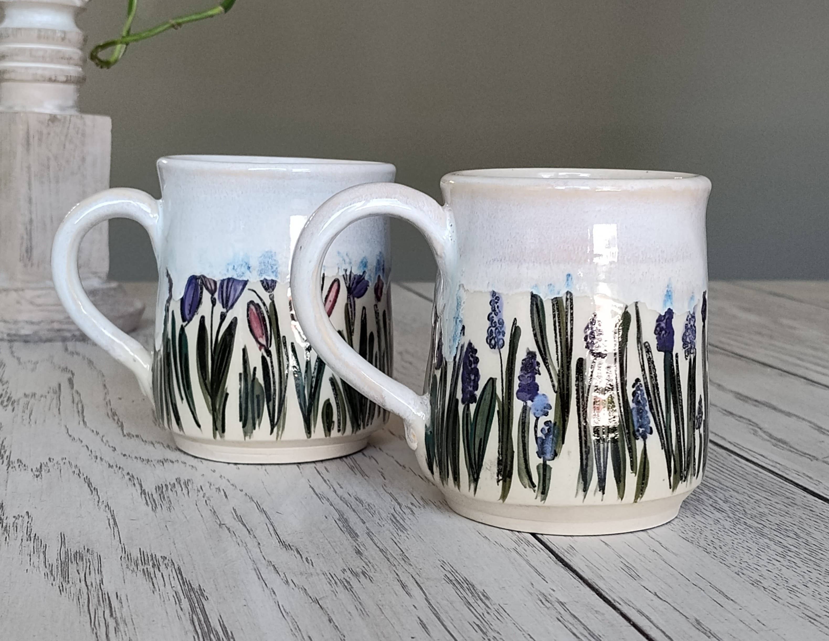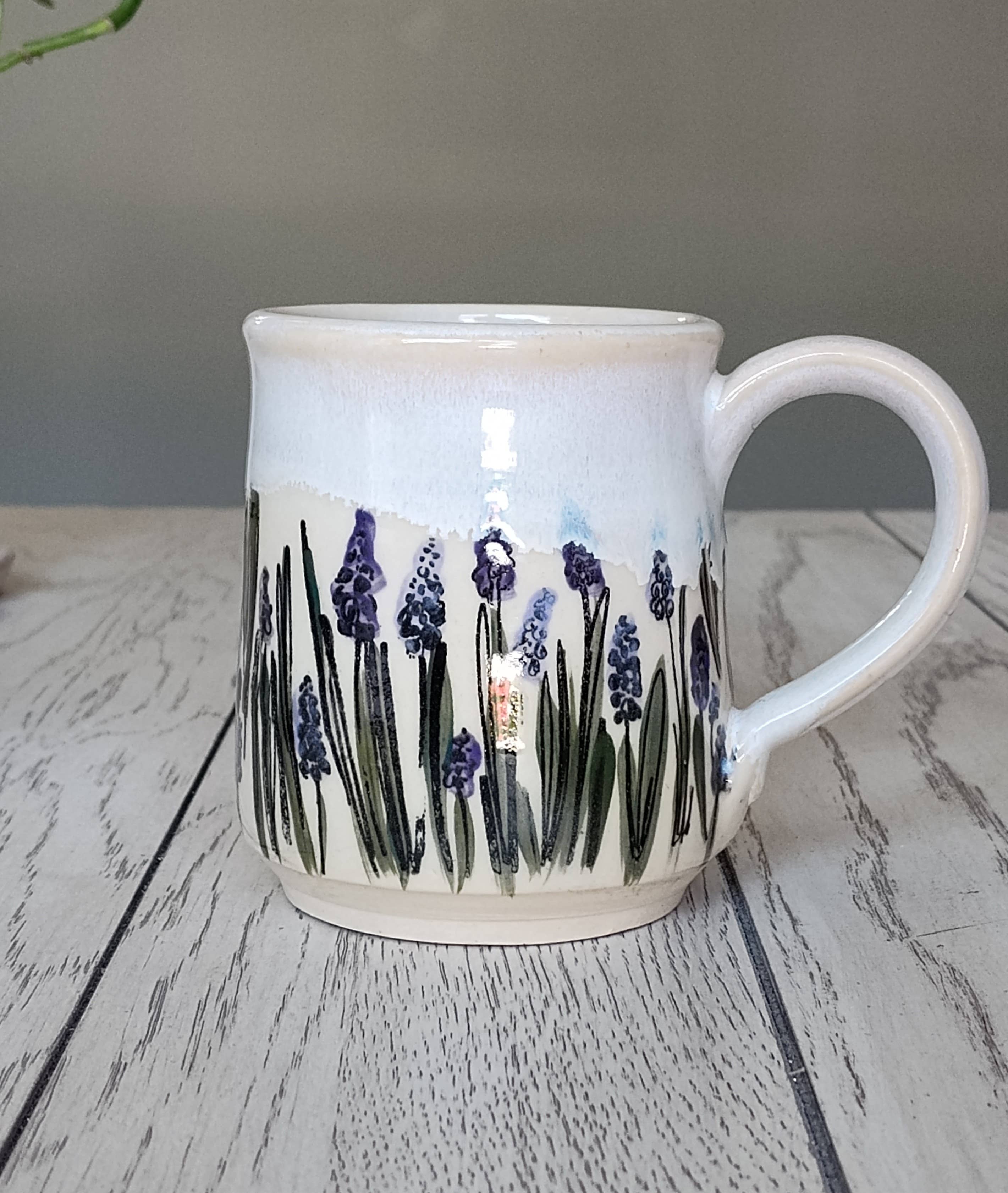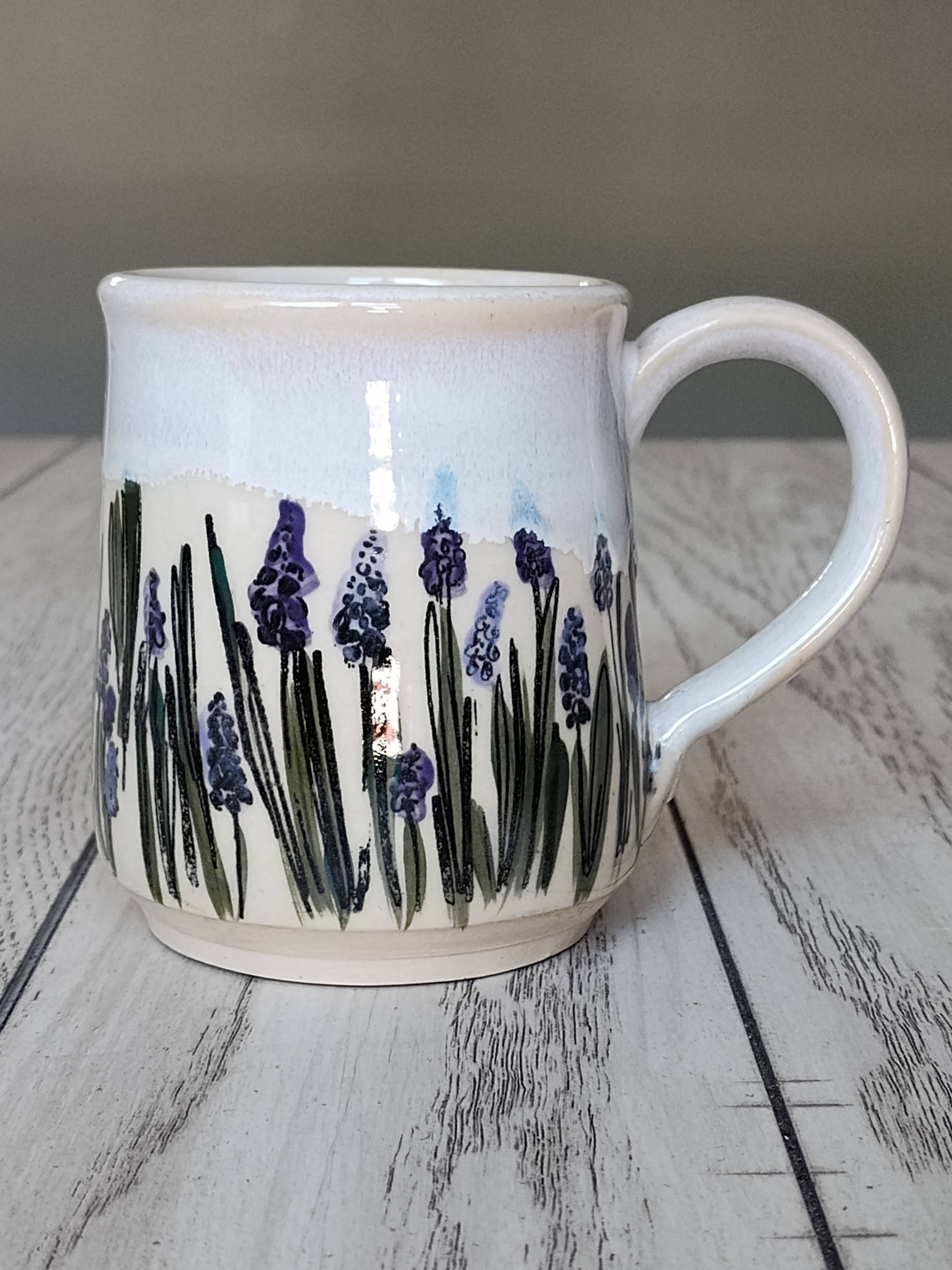 Calming and classic, this 12–16 oz ceramic mug features a hand-illustrated field of grape hyacinths paired with a soft white glaze. The clean finish highlights the floral artwork while offering a timeless look that blends with any kitchen or gift display.