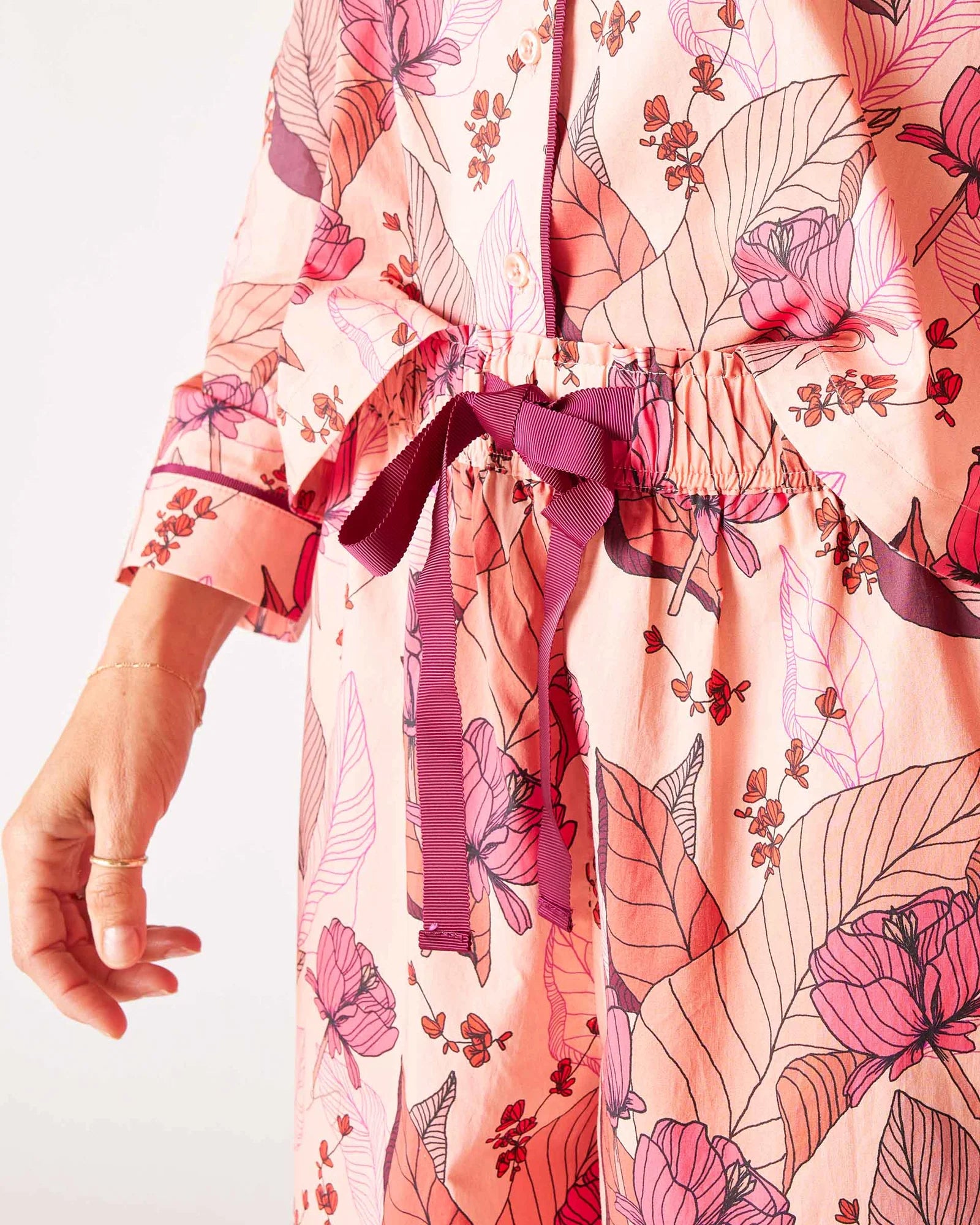 This pajama set is crafted from gentle cotton and boasts intricate details that are difficult to capture in a photo. The vibrant, nature-inspired prints are created by Emily Taylor, a talented artist and flower lover. The PJs become even softer with each wash and provide a cool and comfortable feel against the skin. The wide-legged pants feature a stretch waistband, pockets, and a ribbon tie, while the button-up top has a relaxed swing fit and is adorned with ribbon accents. Get ready for an incredibly dreamy night.