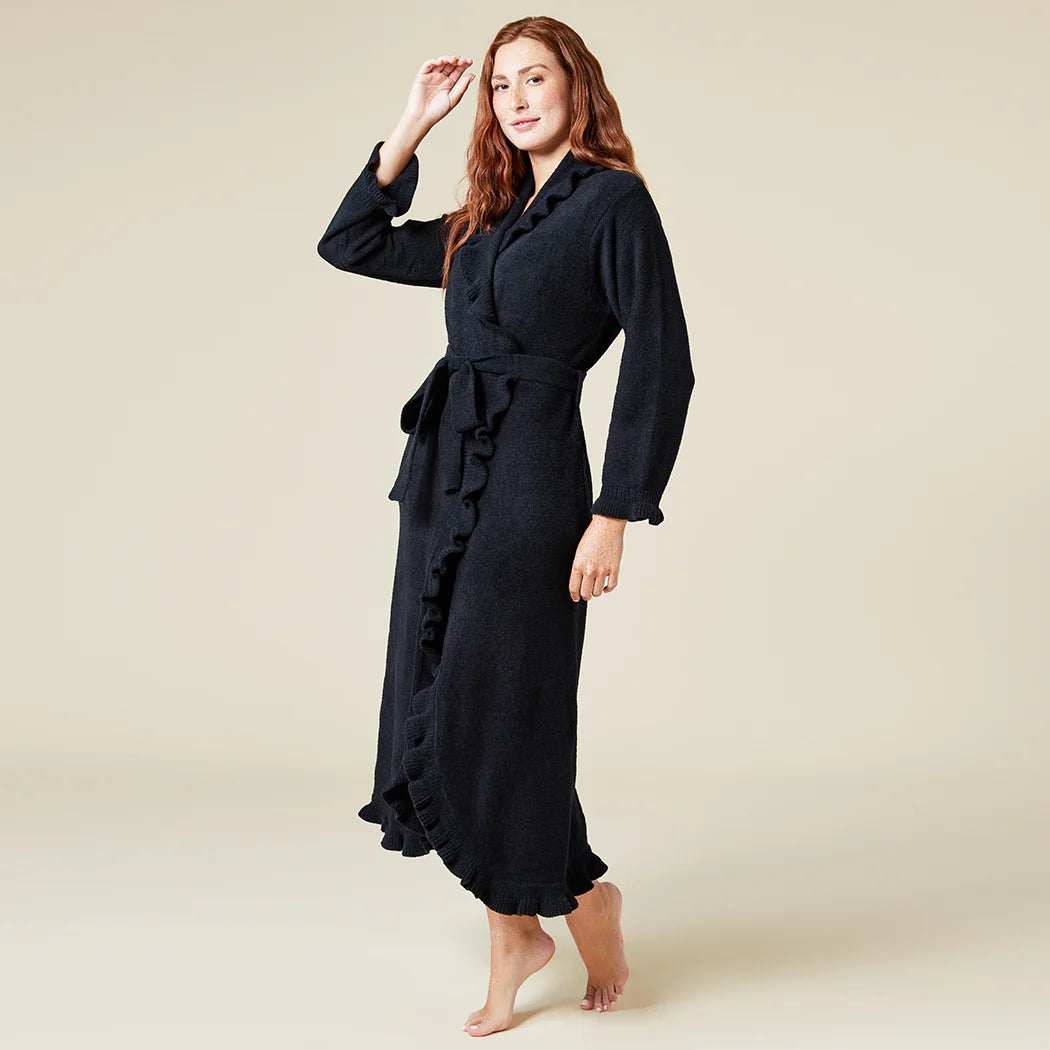 Surround yourself in total comfort with our 51″ ruffled trim robe hand stitched in gorgeous colors. The cascading ruffle softly drapes the neck and gives these classically comfortable robes a flirty, feminine flair. Inside tie, side seam pockets.