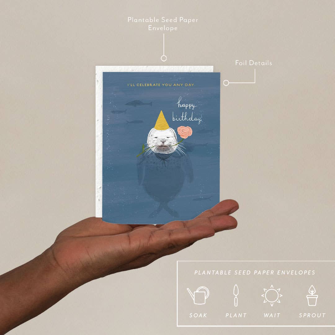 All Seedlings greeting cards have a PLANTABLE seed paper envelope which is embedded with non-invasive wildflower seeds. This seed paper is made of a biodegradable eco-paper created with post-consumer materials - no trees harmed for this paper! When planted, the envelopes compost away leaving only flowers behind.