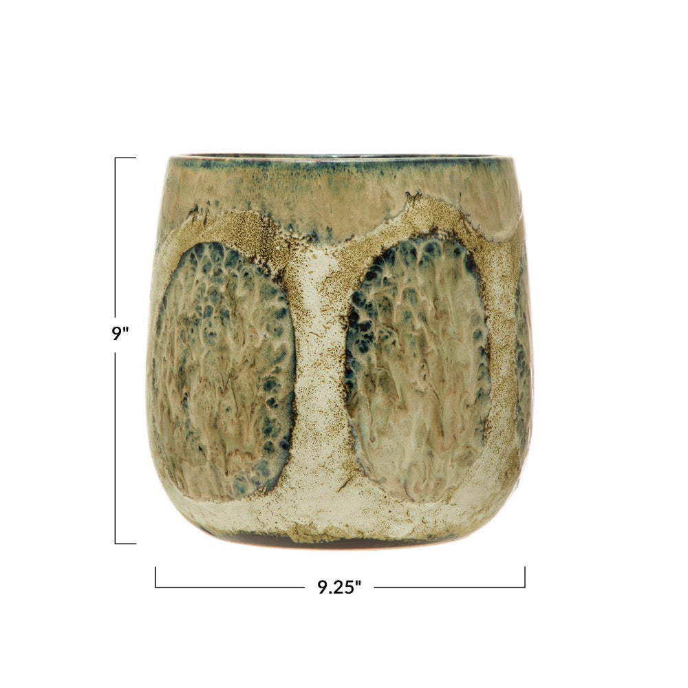 This round planter features a reactive glaze that creates a unique and colorful pattern that varies from piece to piece, giving it a gorgeous and vibrant look. This planter also has an organic shape that adds charm and character to the design.