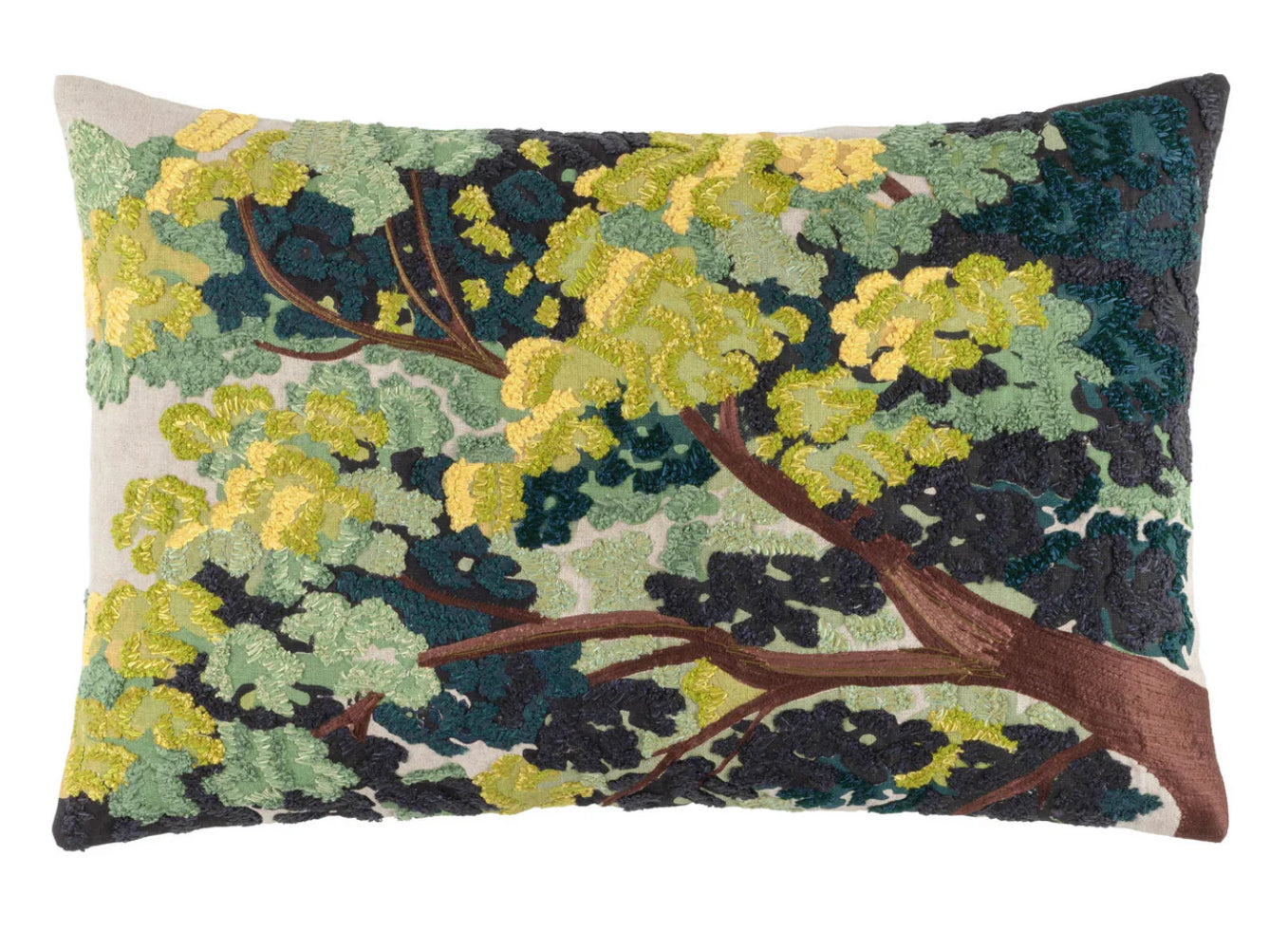 Delicate branches adorned with varying tones of green and blue embroidery extend toward the pillow’s corner. This set features both the intricately designed pillow cover and a premium decorative insert.