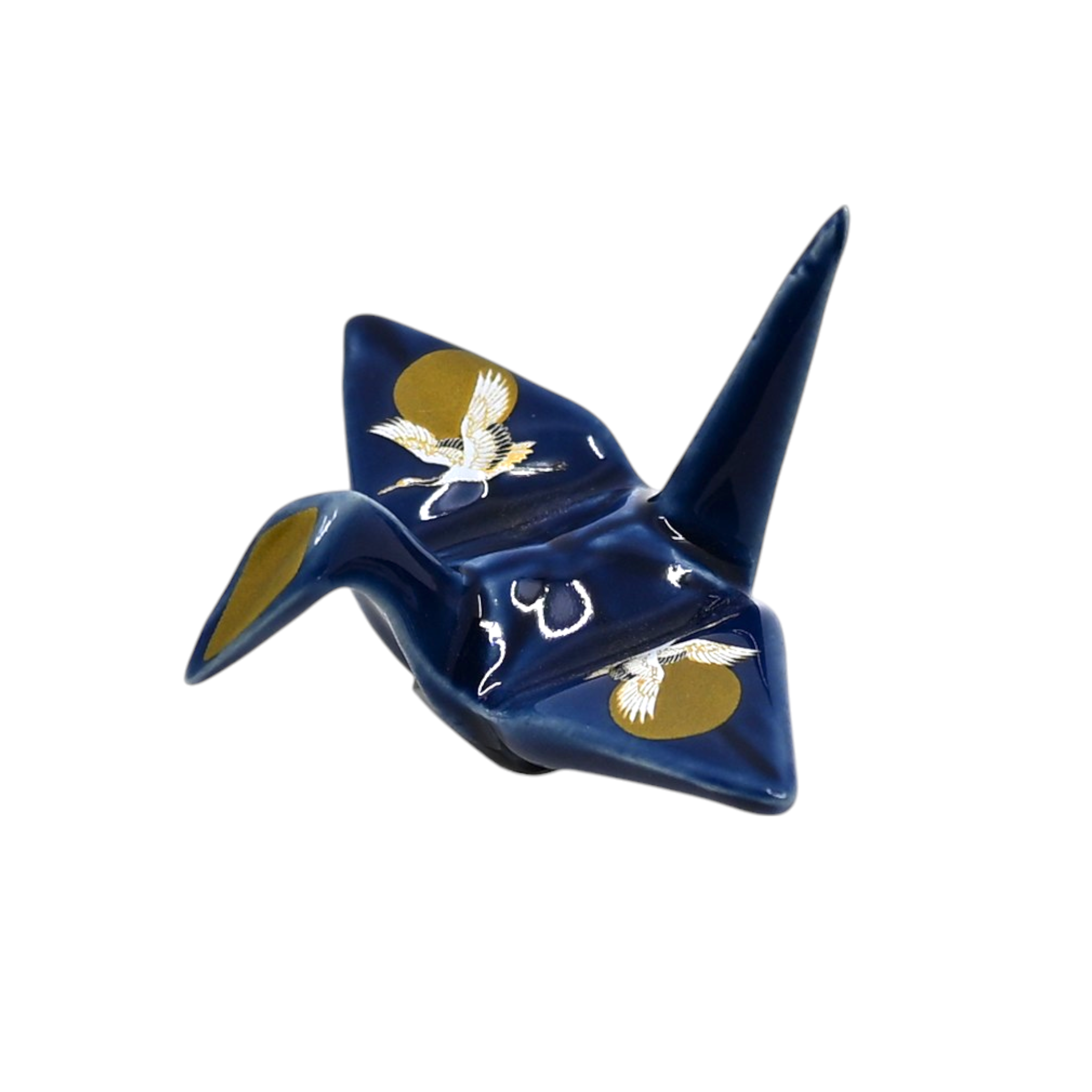 Measuring 2 inches in length, this navy porcelain chopstick rest features a blue origami-style crane design.