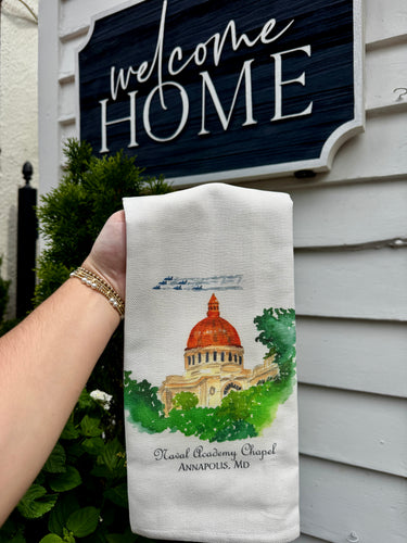 The perfect souvenir or gift for a local, these watercolor style tea towels and Swedish dish towels featuring the Naval Academy Chapel with the Blue Angels Flying over. In 1995, the Chapel was featured on a U.S Postal Service postage stamp, honoring the Academy's 150th anniversary.