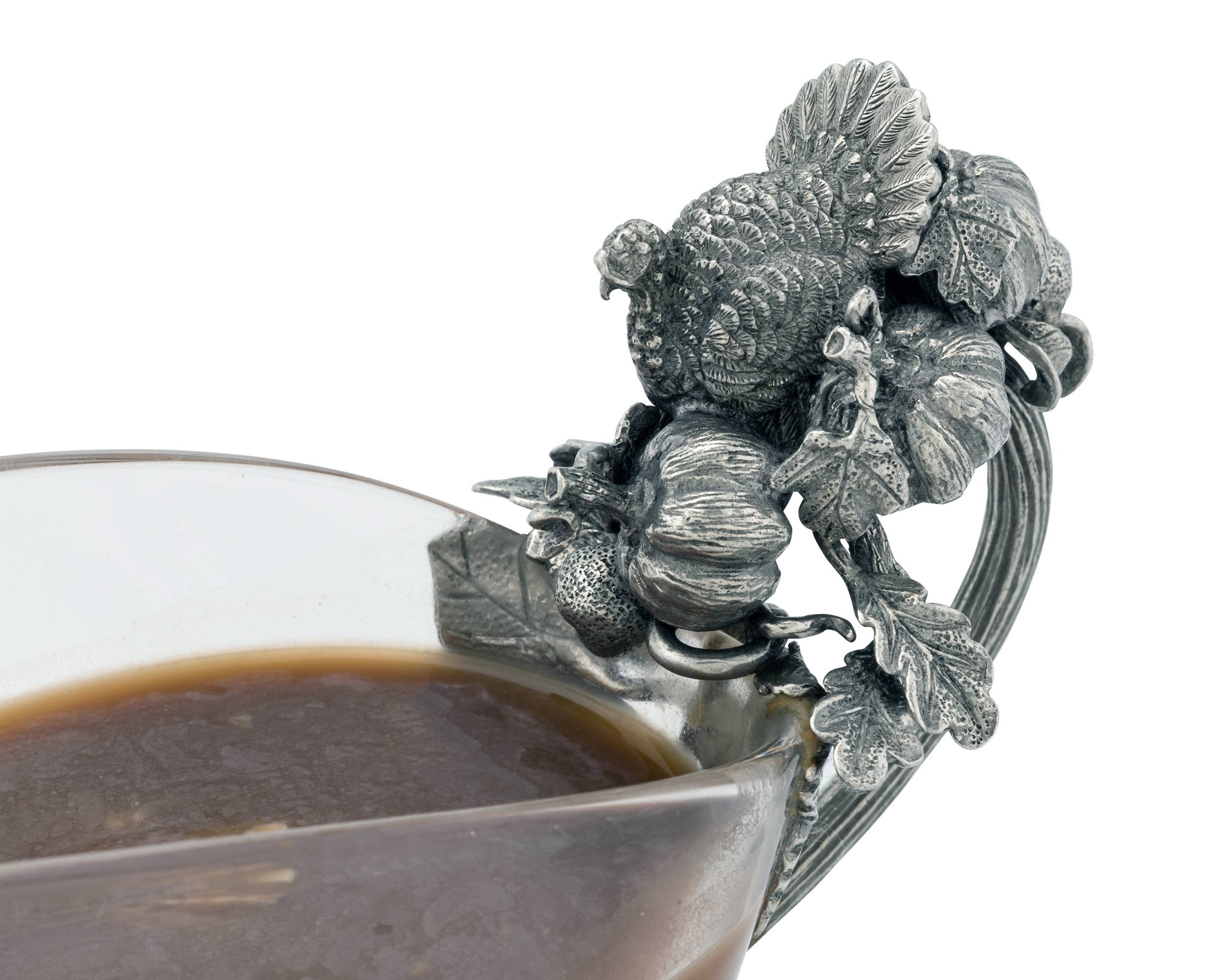 Delight dinner guests with this Vagabond House Harvest Turkey glass gravy boat. Its handcrafted pewter handle is adorned with seasonal elements that celebrate autumn's abundance. Pumpkins, fall leaves and a noble turkey crown the graceful arch of the handle leaving the inside free for gripping. This Vagabond House Harvest Turkey glass gravy boat measures 9 x 3.5 x 6.5 inches, and its curved bowl holds an ample supply of liquid.