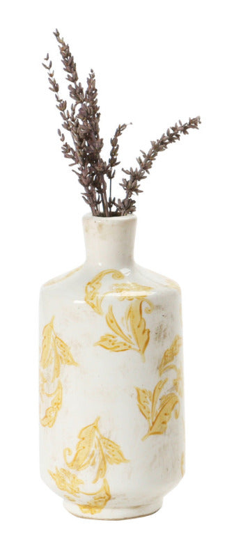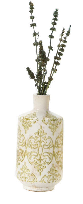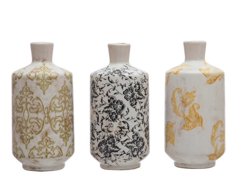 Elegant Terracotta Transfer-ware Vases in yellow, green, and black hues. Versatile neutrals ideal for enhancing bookcases, mantles, and tables.